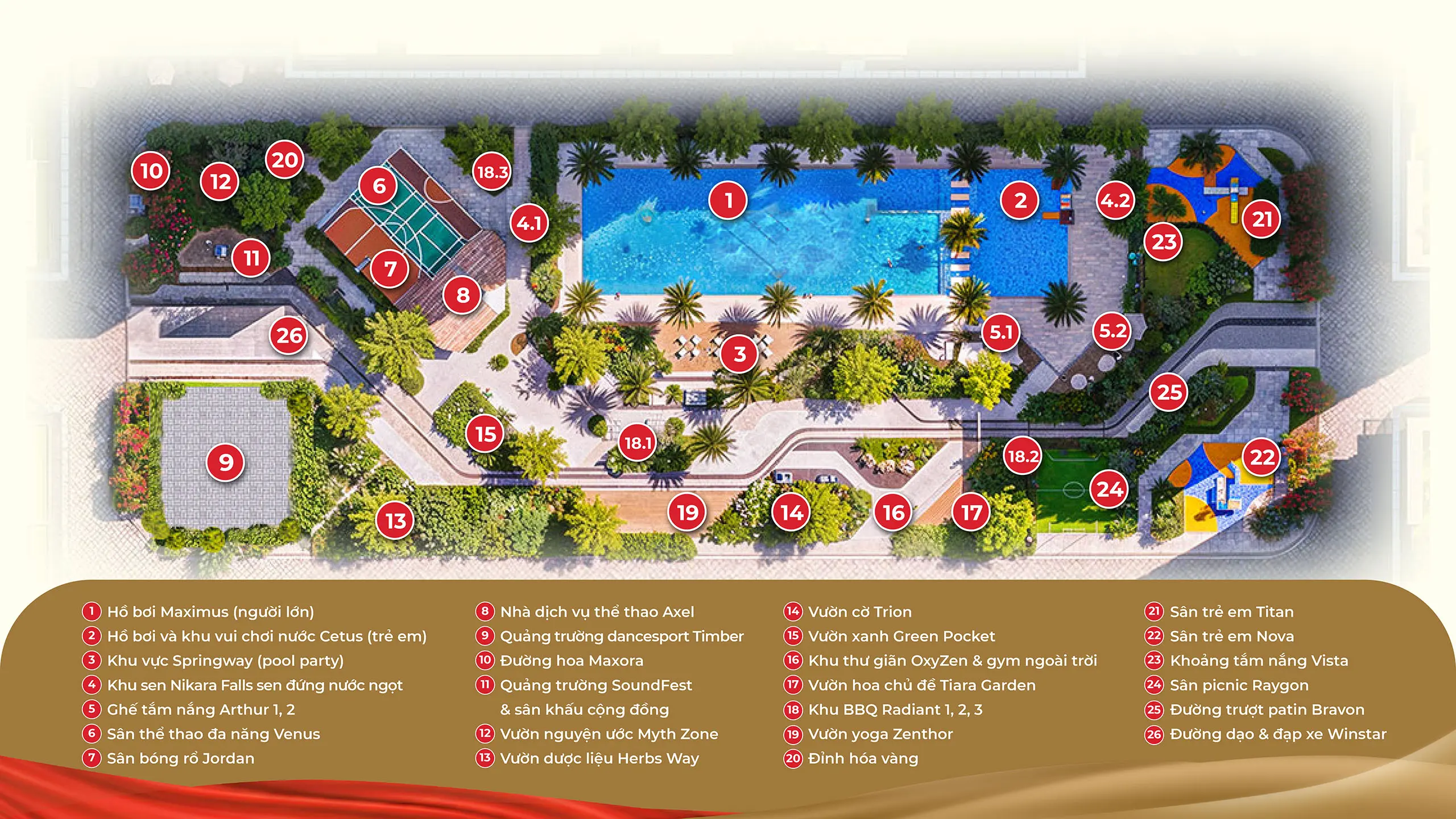 – Với chiều dài 50m và tổng diện tích gần 700m², quần thể hồ bơi người lớn và trẻ em được thiết kế liền mạch, mang đến trải nghiệm thư giãn trọn vẹn cho mọi lứa tuổi.